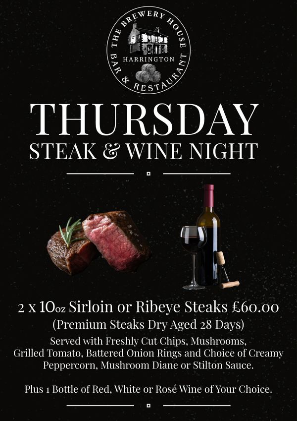 Steak & Wine Night is back at The Brewery House - Harrington!
